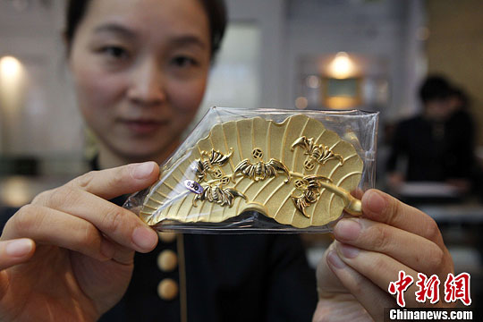 10月25日,河南郑州一金店工作人员展示纯金芭蕉叶家业兴旺。家业兴旺以大自然的芭蕉叶为原形,呈现出市面极为少见的Au9999金叶。中新社发 王中举 摄