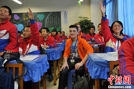 10月25日,来昆明参加第六届“汉语桥”比赛的各国选手们走进昆明中学校门,和中国学生一起上课、学手工、做操。体验中国的中学生活。图为参赛选手与中国学生一同上课。中新社发 任东 摄