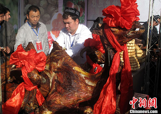 10月25日,“第三届西域美食旅游文化节”在新疆图木舒克市开幕。图为美食节上的烤全骆驼。中新社发 杨东 摄