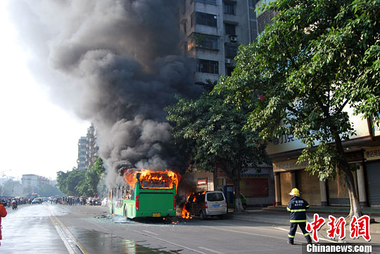 10月25日8时10分,广东韶关市浈江区启明路一公交车起火,引燃了旁边的小面包车,由于事发后时车上乘客已及时疏散,没有造成人员伤亡。中新社发 奚婉婷 摄
