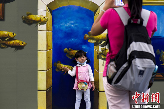 10月29日,在广州图书馆新馆3D错觉艺术展上,栩栩如生的3D地画吸引了不少游客的目光,一位小朋友和“金鱼”合影留念。中新社发 龙宇阳 摄