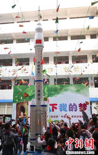 图为南京火瓦巷小学的孩子们在该校师生们用环保材料亲手制作的火箭模型前欢呼。中新社发 泱波 摄