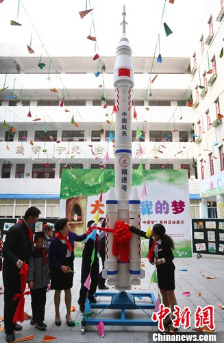 图为南京火瓦巷小学的孩子们在该校师生们用环保材料亲手制作的火箭模型前欢呼。中新社发 泱波 摄