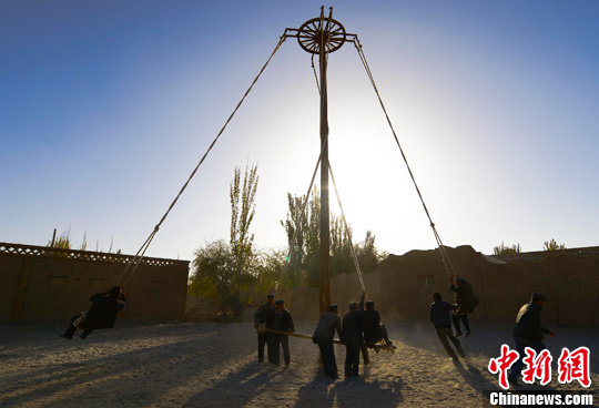 据介绍,萨哈迪游戏是麦盖提县刀郎人最喜爱的活动,翻译成汉语便是空中转轮秋千,秋千是由主轴、木轮和轮杆以绳索连结而成的一个庞大设施。这项活动在以前都是女孩子玩的,如今也有男孩子参与其中。