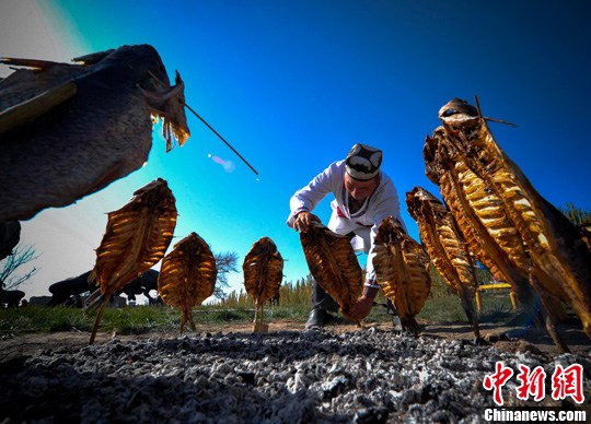 10月下旬,新疆麦盖提县,一位维吾尔刀郎人将用树枝串起的鲤鱼,插在燃烧过的树枝旁烘烤。中新社发 刘新 摄