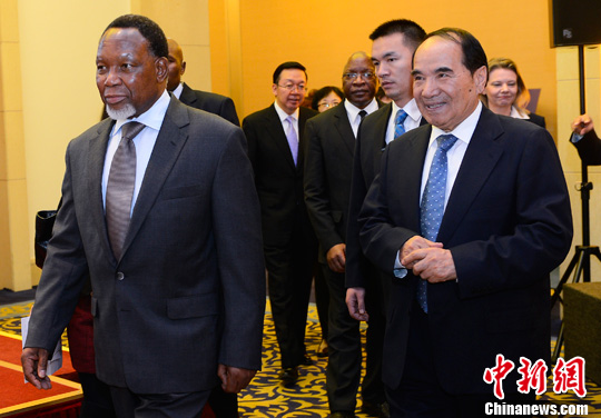 10月29日晚,中国南非经贸文化交流晚宴在北京举行。中国非洲人民友好协会会长阿不来提·阿不都热西提(右)、南非共和国副总统莫特兰蒂等中南双方共150余人出席。中新社发 刘震 摄
