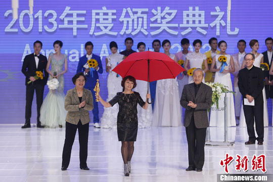 11月1日,中国国际时装周2013年度颁奖典礼在北京举行,刘薇获得第17届中国时装设计“金顶奖”。中新社发 盛佳鹏 摄