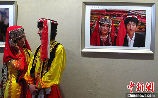 《冰山使者·塔什库尔干塔吉克自治县文化艺术展》11月11日在乌鲁木齐美术馆开幕。图为一对塔吉克青年在开幕式间隙聊天。中新社发 闫文陆 摄