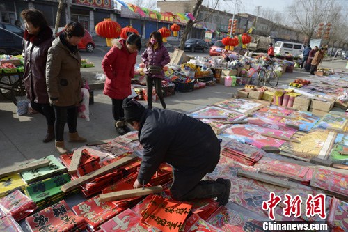1月18日,内蒙古土左旗白庙子镇的一条街上,顾客在选购对联,各种墙贴、对联摆在地上供顾客选购。中新社发 刘文华 摄