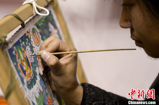 1月19日,中国非物质文化遗产年俗文化展示周在北京石景山体育馆举行,藏族唐卡勉萨画派画师正在作画。中新社发 廖攀 摄
