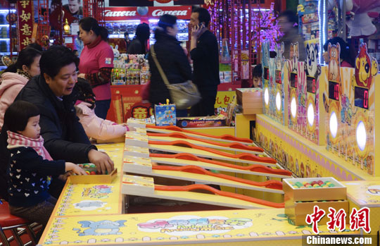 1月28日,北京某商场正在举行室内儿童庙会,父亲带着女儿参加庙会游戏。中新社发 盛佳鹏 摄