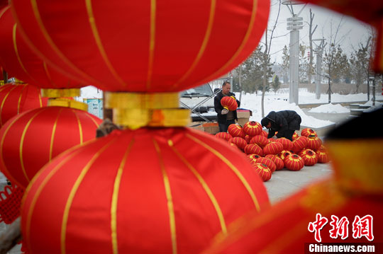 1月29日,新春佳节即将到来,新疆各地通过歌舞、花灯、书画展等文娱活动迎接新年的到来。图为新疆玛纳斯县正在安装大红灯笼。中新社发 马新龙 摄
