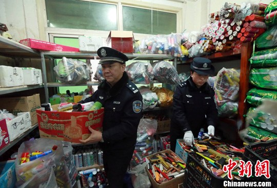 图为武汉铁路民警清理收缴的违禁品。中新社发 赵军 摄