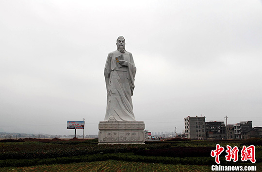 近日,一座采用花岗岩,建设雕塑高6米多的“茶圣”陆羽雕像,形神兼备、潇洒飘逸,耸立在江西省遂川县城东高速路链接口处。中新社发 李建平 摄