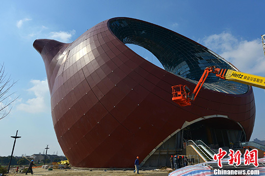 2月10日,一座正在建造的紫砂壶形状的建筑亮相无锡街头,圆滚滚的外形、向内凹起的弧度曲线,建筑的中上部还有一只“撅”起的“嘴巴”,格外的抢眼。中新社发 李一芳 摄