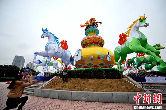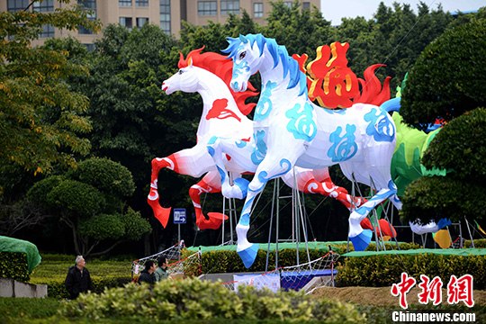 2月10日,中国马年元宵佳节临近,一组“马上有福”巨型花灯亮相福州,吸引市民关注。中新社发 王东明 摄