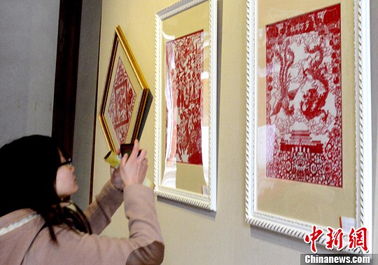2月10日,中国农历元宵节临近。正在福建省海峡民间艺术馆举行的“剪春风——闽台剪纸艺术展”上,50余件福建民间剪纸作品和20余件台湾立体剪纸作品,以其巧妙的构思与创意,将传统与现代相结合,呈现出了鲜明的民族特色。吸引众人观展。中新社发 刘可耕 摄