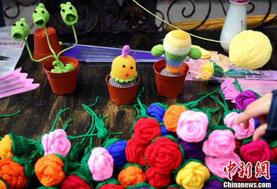 2月10日,南京夫子庙老街上的两位男青年用绒线和钩针编织手工玫瑰花引来围观。中新社发 泱波 摄
