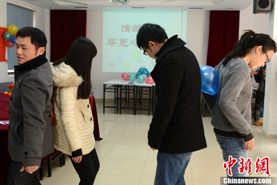 2月11日下午,一群青年男女齐聚苏州沧浪街道养一社区进行了一场元宵联谊会,寻觅心中的他(她)。现场通过“画笔传情”两两配对成功后,还学做纸质鲜花、背靠背pk运气球等,在游戏中互相了解,增进了感情,共同迎接元宵、情人双节的到来。