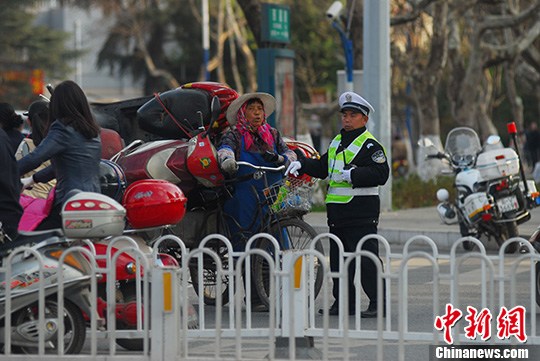 2月11日,交警拦下一超载电动车辆。从2月10日起,昆明市公安局开展为期11个月的电动车集中整治行动,电动车的各类交通违法行为是整治重点之一。中新社发 蒋卓成 摄