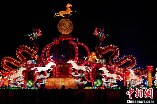 2月11日晚,河南鹤壁,中原春节灯会点亮各式花灯,花灯中处处体现着马年气息,集中展示出民间花灯,营造喜庆、欢乐、祥和的节日氛围。中新社发 王中举 摄