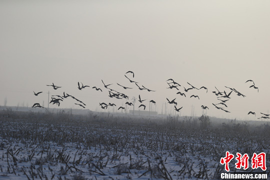 2013年11月初,约2000只国家三级野生保护动物豆雁飞抵新疆伊犁哈萨克自治州察布查尔锡伯自治县越冬。中新社发 库尔班江 摄