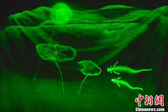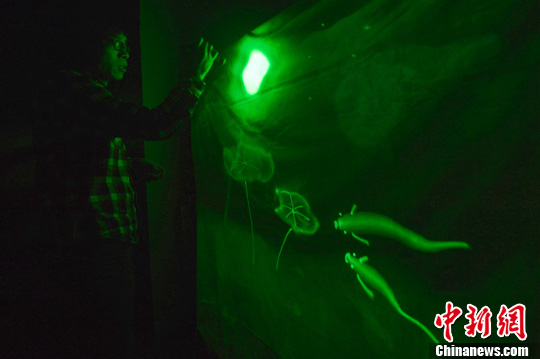 2月12日,38岁的天津籍画家王春来在黑暗的环境中绘制“荷塘月色”光影画引人入胜。光影画是用大中小三种型号的手电筒作为画笔,以手电筒发射的紫光照射在涂有荧光粉的画布上,留下醒目的点和线,持续达1分钟左右。中新社发 佟郁 摄
