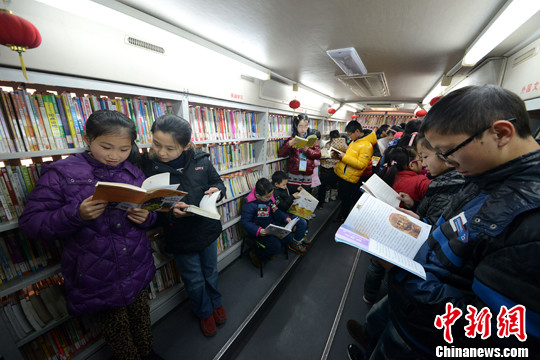 图为孩子们在“流动图书大蓬车”上看书。中新社发 王思哲 摄