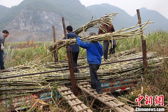 广西蔗农严寒中抢收甘蔗