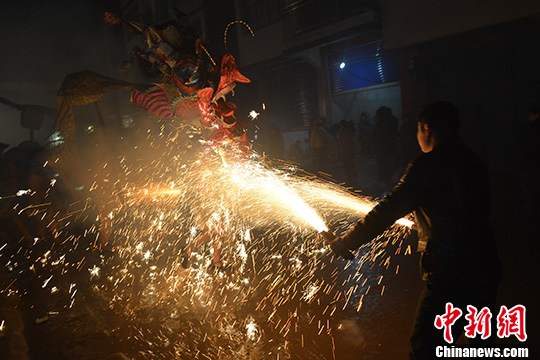 2月12日晚,位于四川达川石桥古镇的中国红色第一街——列宁街上演烧火龙闹元宵活动,一条由数名赤膊的男性高举的火龙游街走巷穿梭,古镇上每户居民用硝磺、柴碳等原料配制成烟花、“土火箭”,在锣鼓声中尽情地对准火龙燃放,使之火花四溅。这项闹元宵的方式已经在当地延续了上千年,民众通过这种方式祈福新的一年风调雨顺、五谷丰登。
