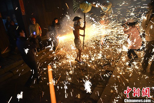 居民用硝磺、柴碳等原料配制成烟花、“土火箭”,对准火龙燃放,现象火花四溅。张浪 摄
