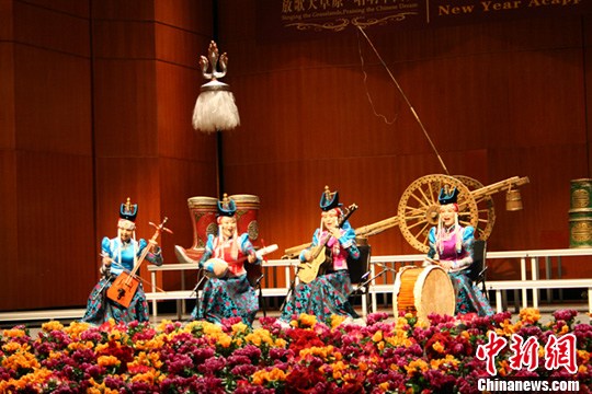 2月12日晚,2014新春音乐会无伴奏合唱专场演出在呼和浩特市正式开演,内蒙古民族艺术剧院的演员们为观众带来了无伴奏合唱和呼麦等精彩演出。中新社发 纳日夫 摄