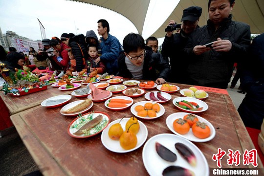 2月13日,一桌全部用面粉制作的特色“菜肴”亮相福州,吸引许多人围观。中新社发 王东明 摄