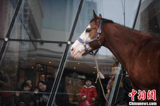 2月16日,重庆一商场大门外拴了一匹马,吸引不少顾客驻足观看。据悉,商场为吸引顾客,以高额的价格租马来供市民免费展出。凡在商场消费的市民,无论金额多少即可拿着收银小票,于当天与马拍照合影。