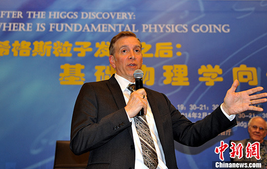 图为美国加州大学圣巴巴拉分校教授、2013年基础物理奖获得者Joseph Incandela演讲。中新社发 孙自法 摄