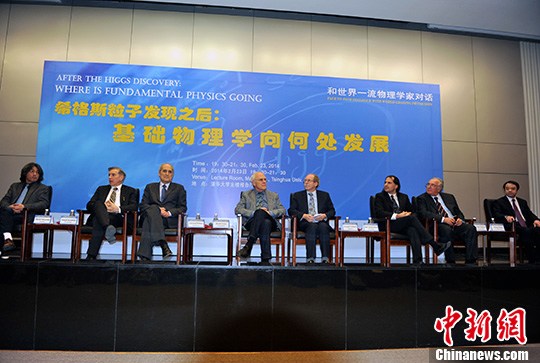 2月23日晚,包括诺贝尔奖、菲尔兹奖得主在内的近10位世界一流物理学家在北京相聚一堂,在清华大学围绕“希格斯粒子发现以后:基础物理学向何处发展”为主题展开对话。中新社发 孙自法 摄