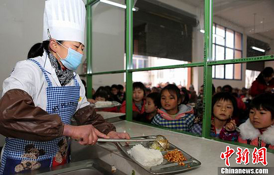 2月24日,四川省华蓥市永兴小学学生食堂的工作人员,在给学生分发“营养午餐”。邱海鹰 摄