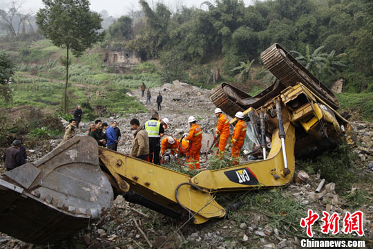 2月25日下午15时许,重庆大渡口区民乐村一工地,一辆正在作业的挖掘机不慎从20余米高的山坡上翻落,驾驶员被困驾驶室,消防人员赶到后将司机救出。中新社发 田辉世 摄