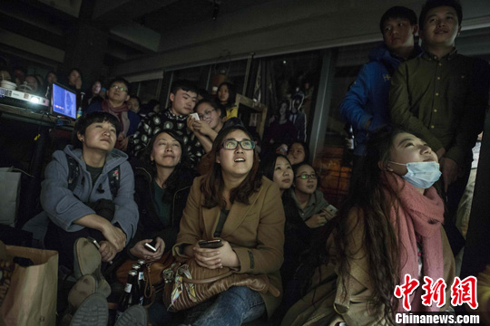 2月27日,200余粉丝在北京三里屯一咖啡馆集体观看近来在中国火爆异常的韩剧《来自星星的你》大结局。图为众多粉丝在现场一起观看该剧大结局。中新社发 崔楠 摄