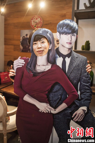 图为粉丝在千颂伊、都敏俊二人的纸板模型后拍照留念。中新社发 崔楠 摄
