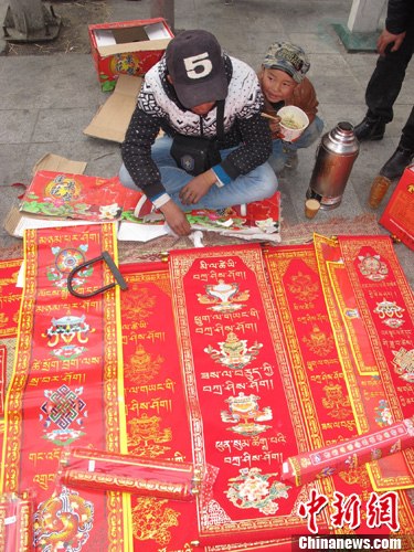 3月2日是藏历的新年,随着这一天的临近,许多藏民开始为庆祝新年置办年货,在拉萨街头,有不少人售卖藏式对联,上面的藏式传统图案和文字寓意着来年的吉祥。中新社发 杨喆 摄