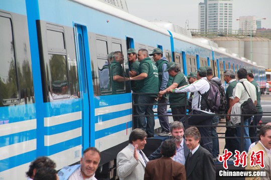 阿根廷内阁首席部长卡皮塔尼奇2月26日率内阁主要官员前往布宜诺斯艾利斯港,为来自中国的城际列车举行展示仪式。这次运抵阿根廷的车组由9节车厢组成。去年1月,阿根廷向中国企业采购了55个车组,供萨米恩托和米特雷两条城铁线使用。中新社发 裘征宇 摄