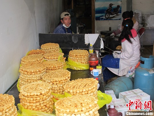 2月下旬,随着藏历新年的不断临近,在拉萨市内街头上,可见不少经营其他商品的店铺临时出租,经营年货,卡赛作为藏历新年中重要的民族食品更是受到青睐。中新社发 杨喆 摄