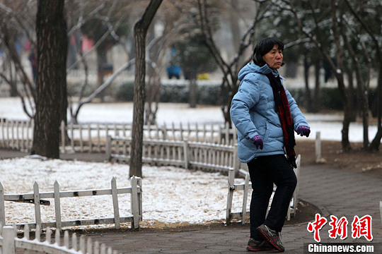2月28日,山西太原迎来一场春雪,一名市民在春雪中晨练健身。中新社发 张云 摄