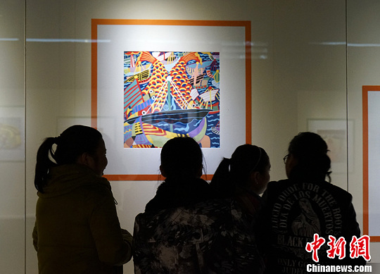 2月28日,浙江舟山浙派海岛艺术家的80余幅舟山渔民画在杭州中国扇博物馆展出,吸引众多民众参观。中新社发 李晨韵 摄