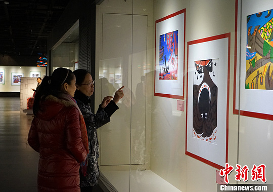 2月28日,浙江舟山浙派海岛艺术家的80余幅舟山渔民画在杭州中国扇博物馆展出,吸引众多民众参观。中新社发 李晨韵 摄