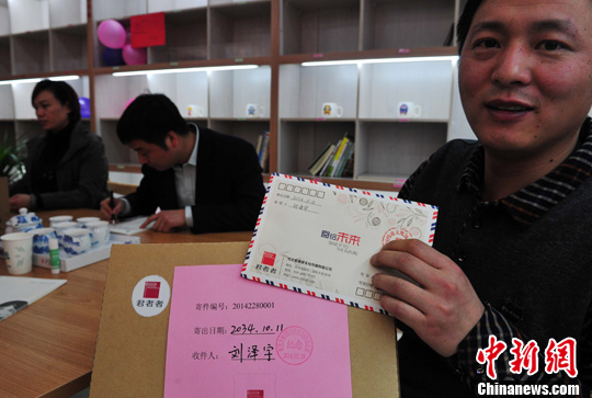 3月3日,店老板展示一封邮给2034年的信件。当日,不少民众在河北首家“慢递”店内给几年后的他(她)写信。中新社发 翟羽佳 摄
