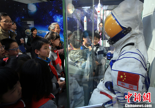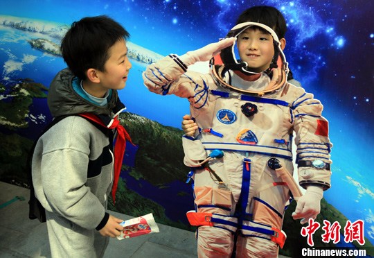 3月15日,“走近中国载人航天神器”展览在上海交通大学钱学森图书馆开幕。宇航员服装、航天食品等实物,加上丰富多彩的“航天词典”、“航天小模型”互动体验,使展览成为当地特色科普公益课堂,吸引孩童。中新社发 潘索菲 摄