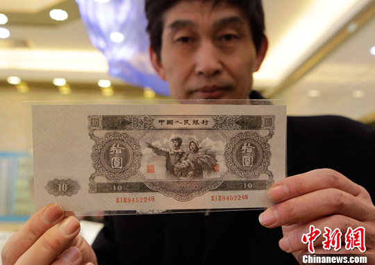3月15日,河南钱币经三路店,61岁男子展示半个多世纪的同龄10元人民币,当日报价30万元。据了解,这张面值10元的人民币,是1953年的中国第二套人民币,俗称“大黑十”,市场上很少有全新品相,价格一路看涨。中新社发 王中举 摄