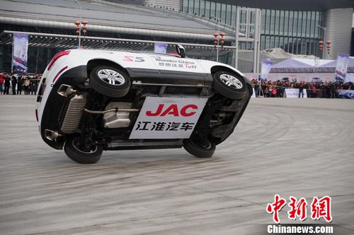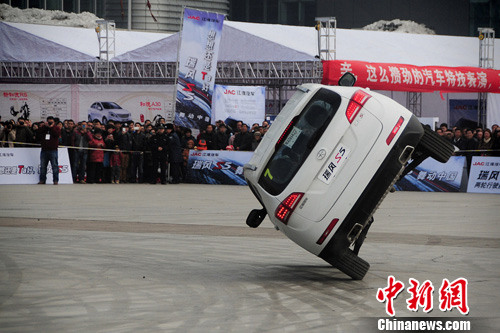 3月15日,位于乌鲁木齐市的红光山国际会展中心正在举办“2014新疆3.15春季国际车展”。有汽车品牌为展示汽车性能,请来特技表演团队,为观众表演了惊险的两轮绕圈行驶等特技,表演成功后现场观众一片欢呼。